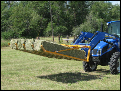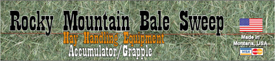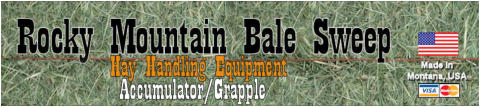 Rocky Mountain Bale Sweep is the quickest, labor saving, most cost effective way to pick up small square hay bales from the field and load them on to a trailer or hayrack, without pushing or dragging bales accross the ground. No need to buy two pieces of equipment, Bale Sweep will pick up and load hay by carrying hay up and off the ground. It will work with 14x18 or 16x18 bales. Load a trailer, hayrack, put bales in a stack, into the barn, load the hayrack on a horse trailer, use for feeding details, or just pick up hay after your custom cut and baler leaves.